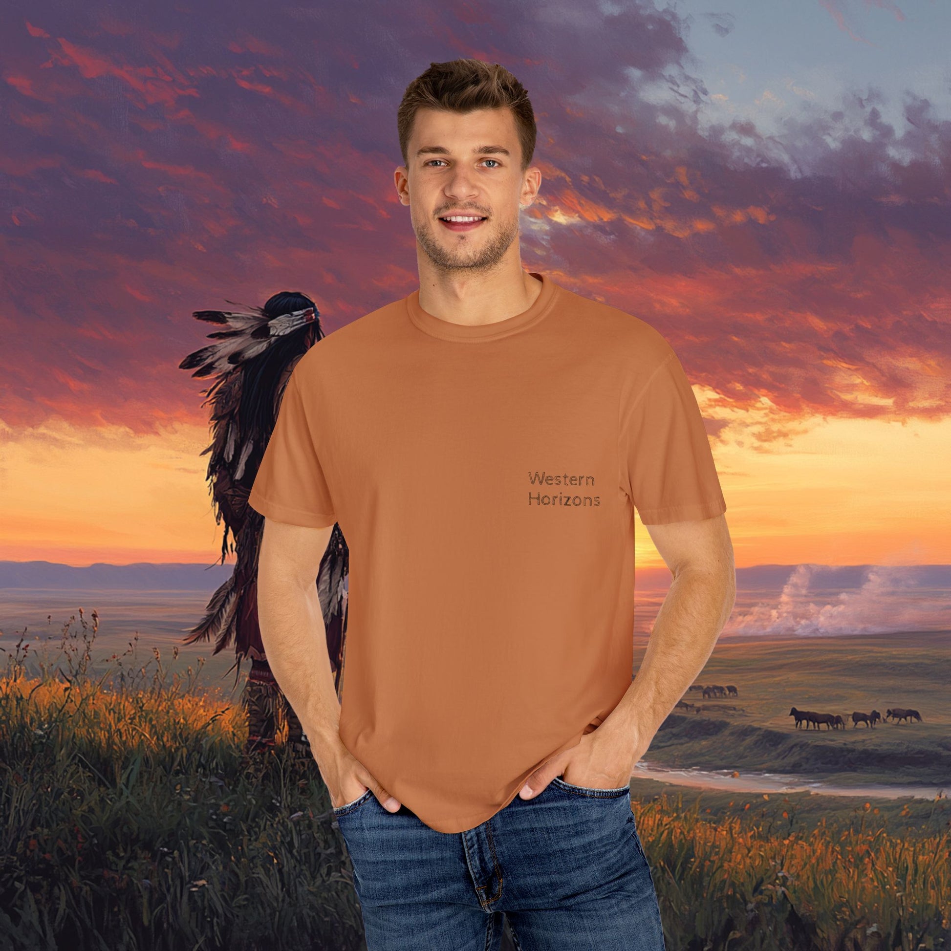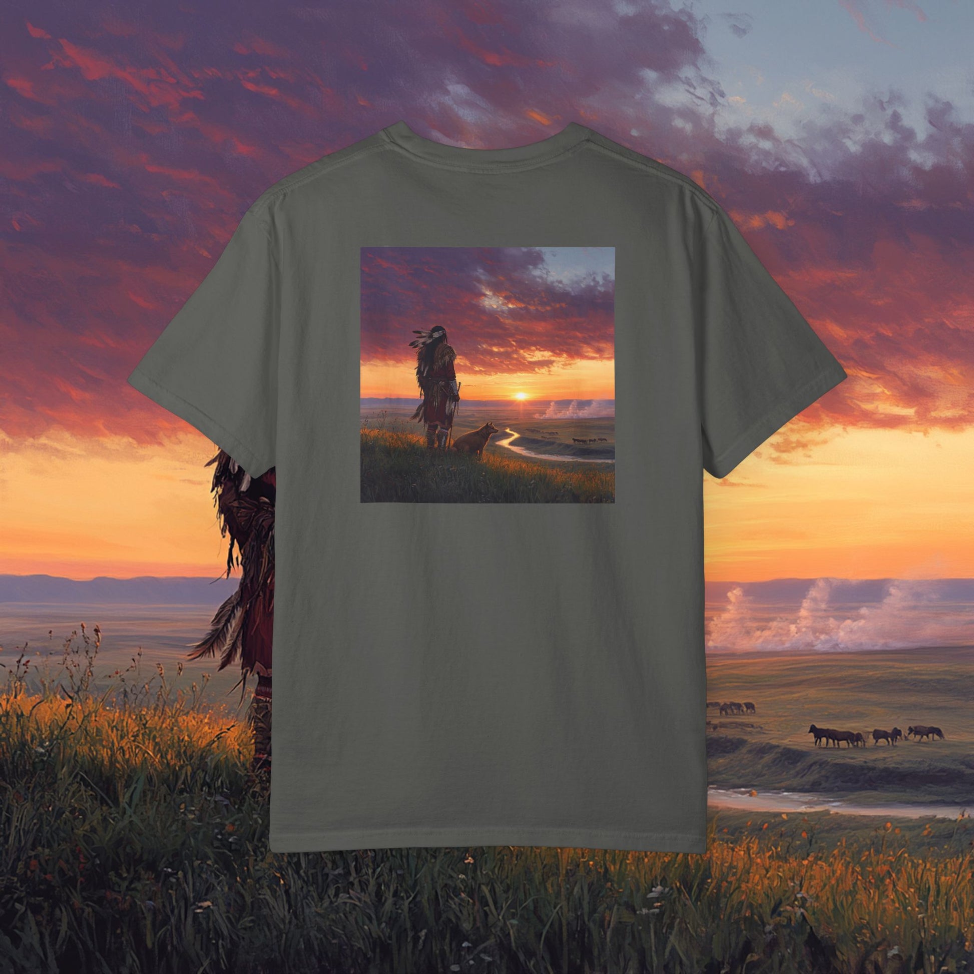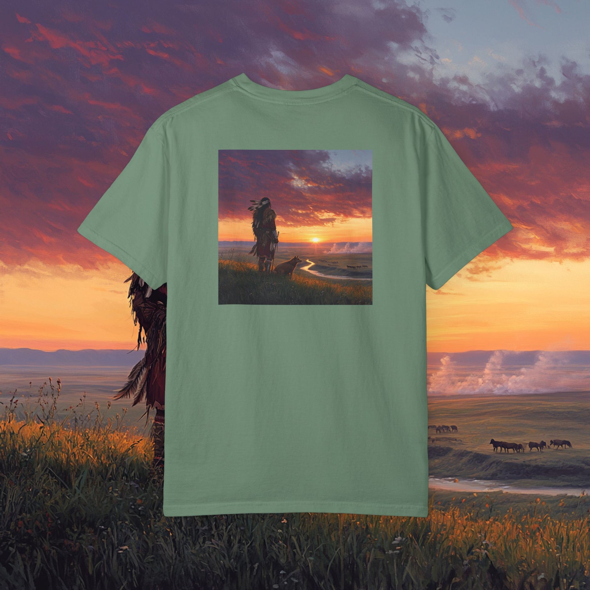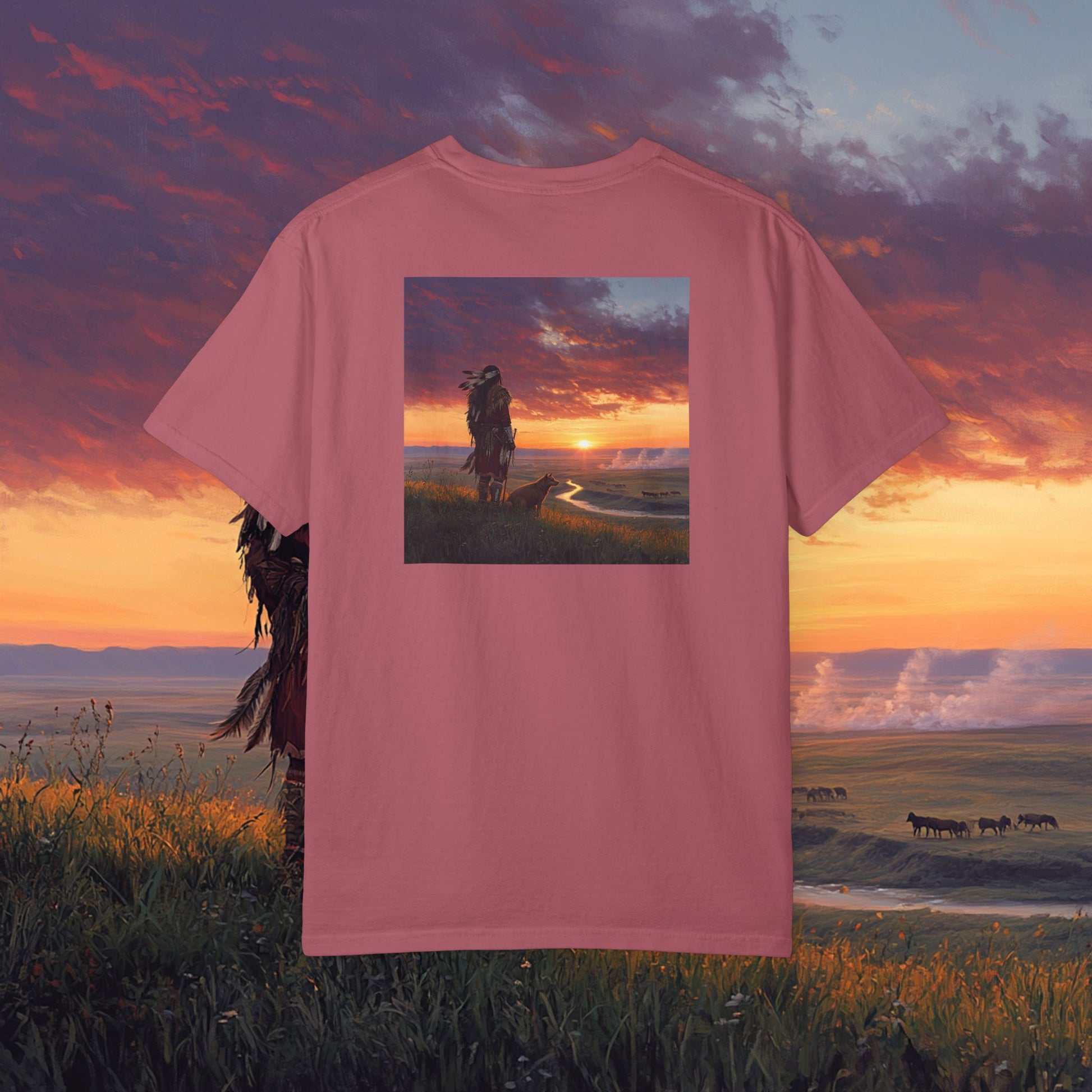 Experience the beauty of Native American art with this Comfort Colors T-shirt. Perfect for those who appreciate intricate designs and meaningful landscapes. This garment is ideal for anyone who enjoys cultural artwork and wants to showcase their style with a unique and eye-catching tee. Great for cultural events, art festivals, and everyday wear. Product features - Available in sizes S to 4XL for a perfect fit - Made with garment-dyed fabric for soft color and texture - Double-needle stitching for durability - Knit in one piece without side seams for a more attractive finish - Relaxed fit and crew neckline for comfort and style Care instructions - Machine wash: cold (max 30C or 90F) - Do not bleach - Tumble dry: low heat - Iron, steam or dry: low heat - Do not dryclean