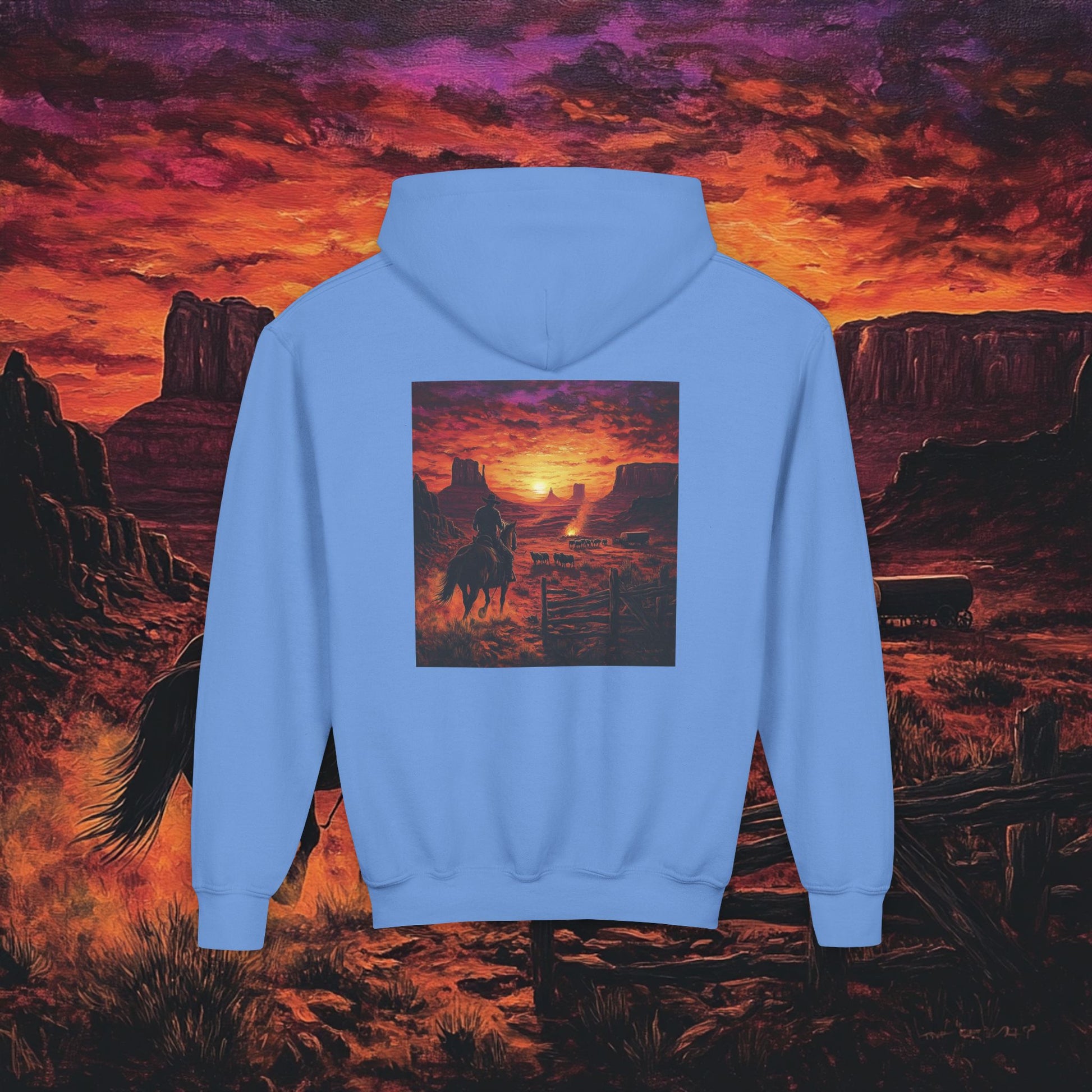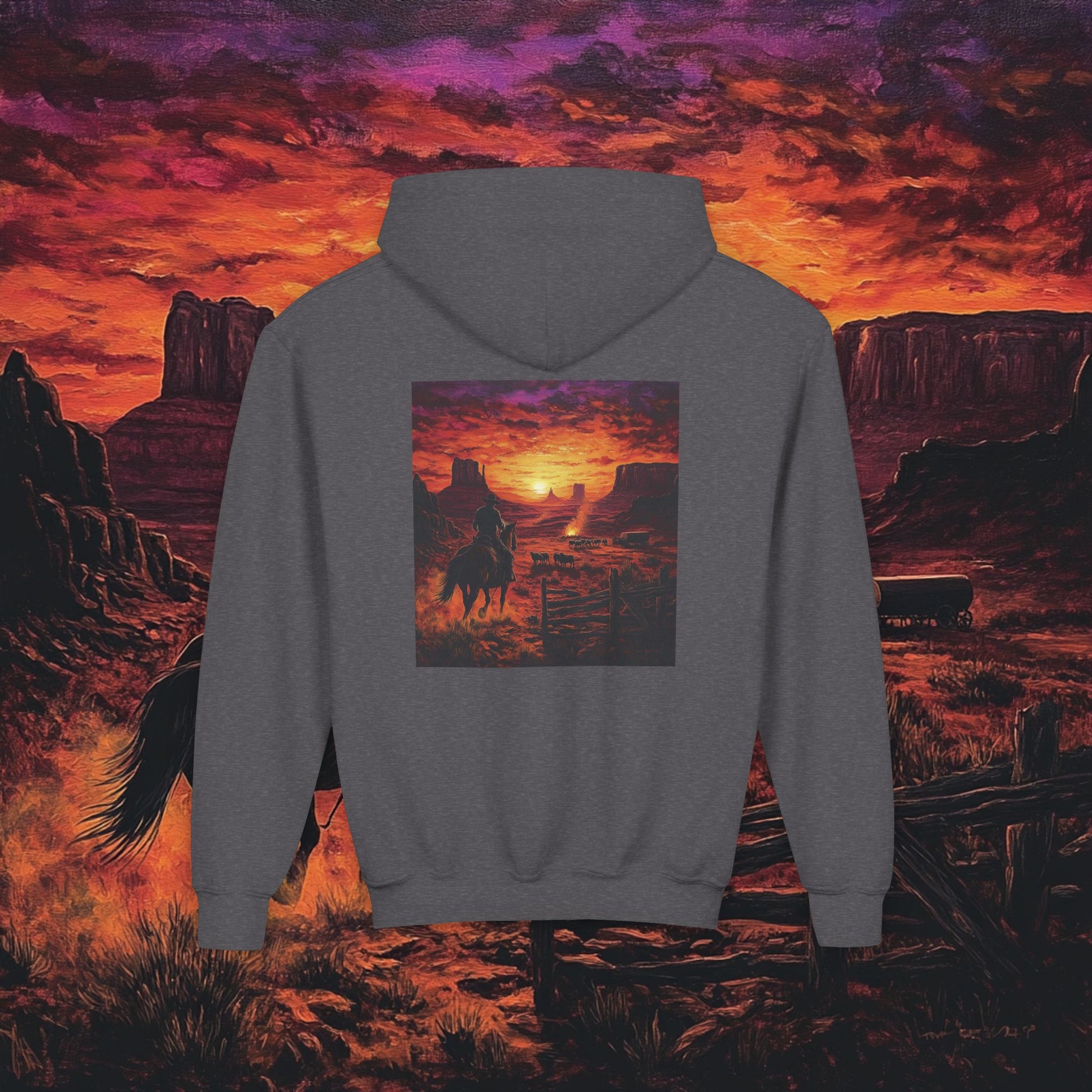 Stay cozy and stylish with this Youth Heavy Blend Hooded Sweatshirt, perfect for every young adventurer. Embrace the outdoors and express individuality with its unique design that captures the essence of western horizons. Ideal for layering, this sweatshirt effortlessly transitions from chilly morning outings to evening bonfires with friends. It’s a must-have for children who love exploring nature and appreciate artistic flair. Whether it's a birthday gift, a thoughtful holiday surprise, or a celebration of back-to-school, this sweatshirt brings warmth and style to every occasion.