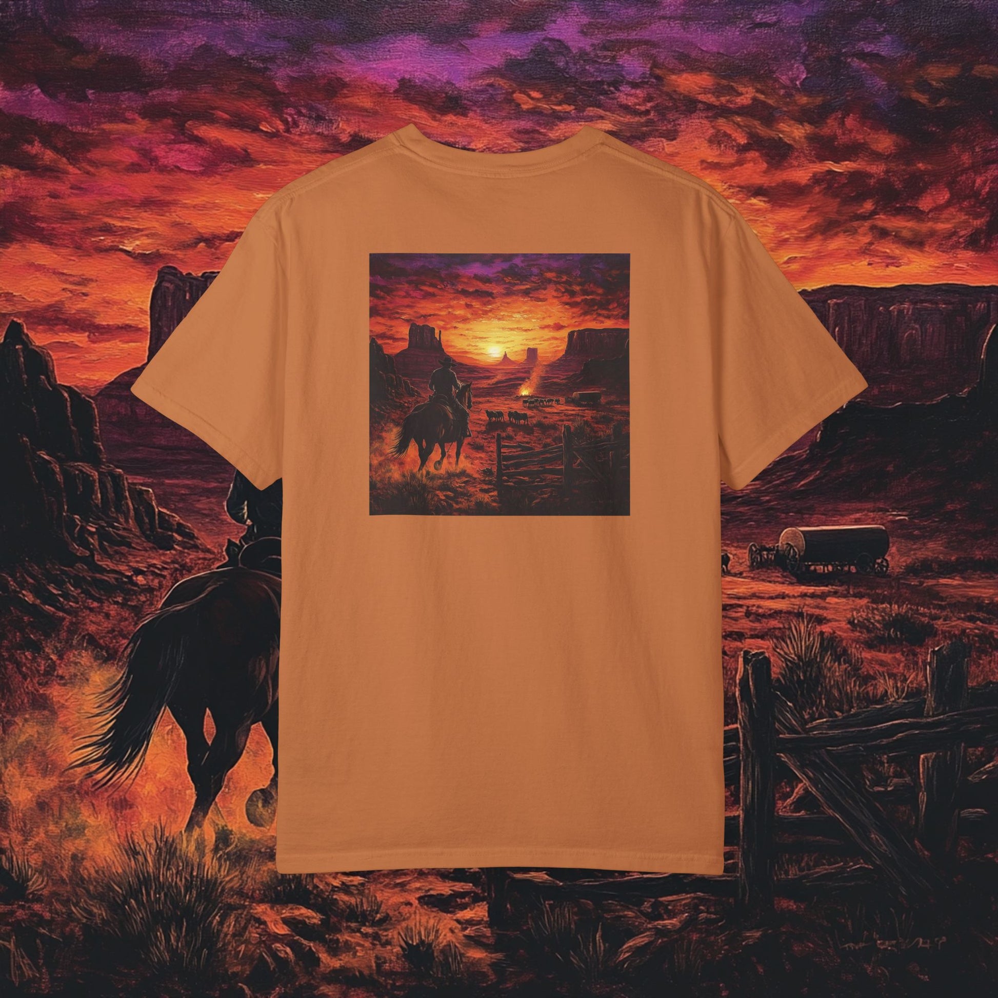 Capture the essence of the Old West with this Comfort Colors T-shirt. The Western landscape design is perfect for those who love country living and appreciate the beauty of a sunset. This unisex garment-dyed T-shirt is made with high-quality 100% ring-spun US cotton, ensuring long-lasting comfort and style. Whether worn casually or semi-formally, this T-shirt is versatile and easy to accessorize. Perfect for adults who enjoy Western-themed apparel and appreciate the soft color and texture of garment-dyed fabric. Ideal for holidays like Thanksgiving and occasions like Western-themed parties. Product features - Available in multiple sizes from S to 4XL for the perfect fit - Double-needle stitching for durability - Made with garment-dyed fabric for a soft texture - Relaxed fit and crew neckline for comfort and style - Available in 58 colors for variety Care instructions - Machine wash: cold (max 30C or 90F) - Do not bleach - Tumble dry: low heat - Iron, steam or dry: low heat - Do not dryclean