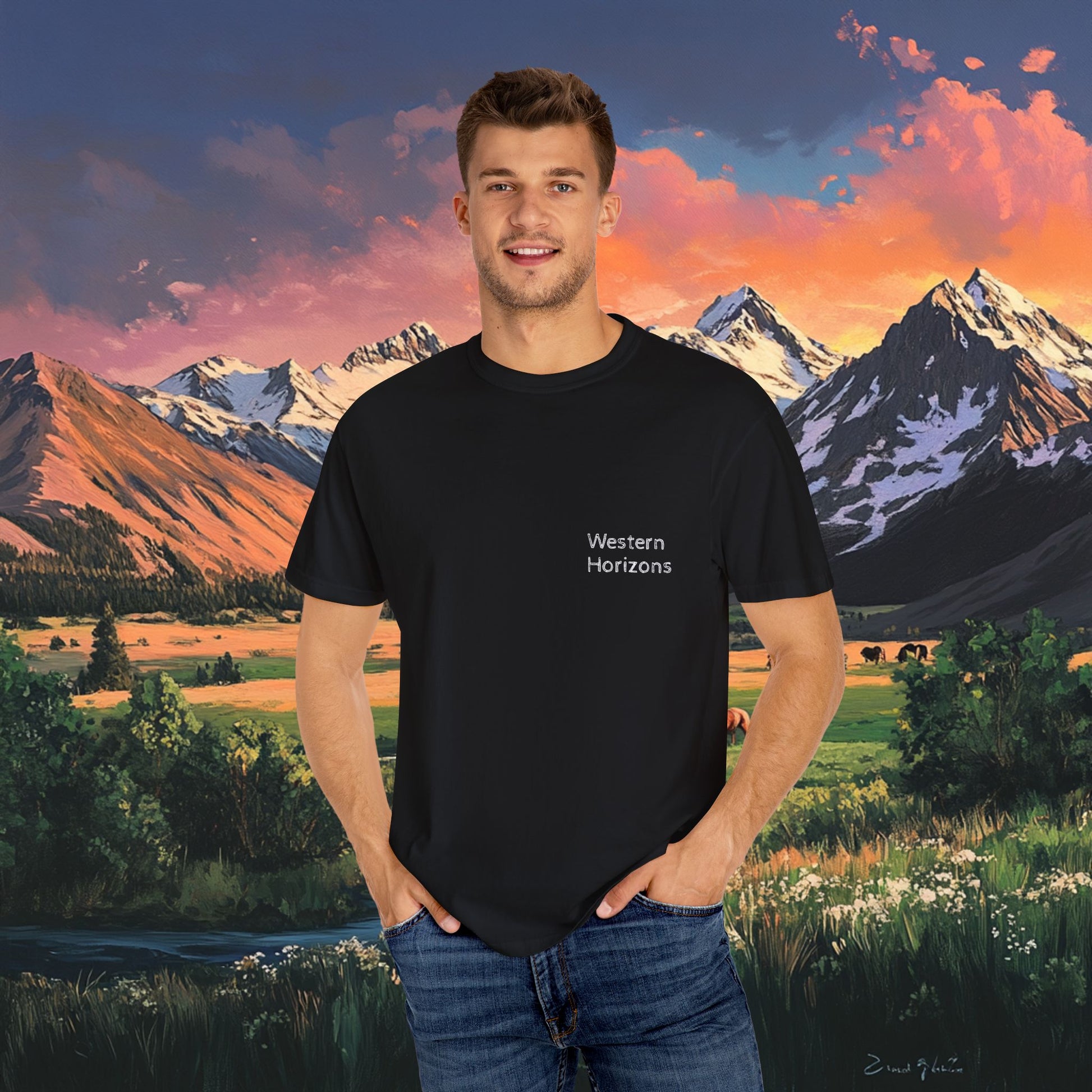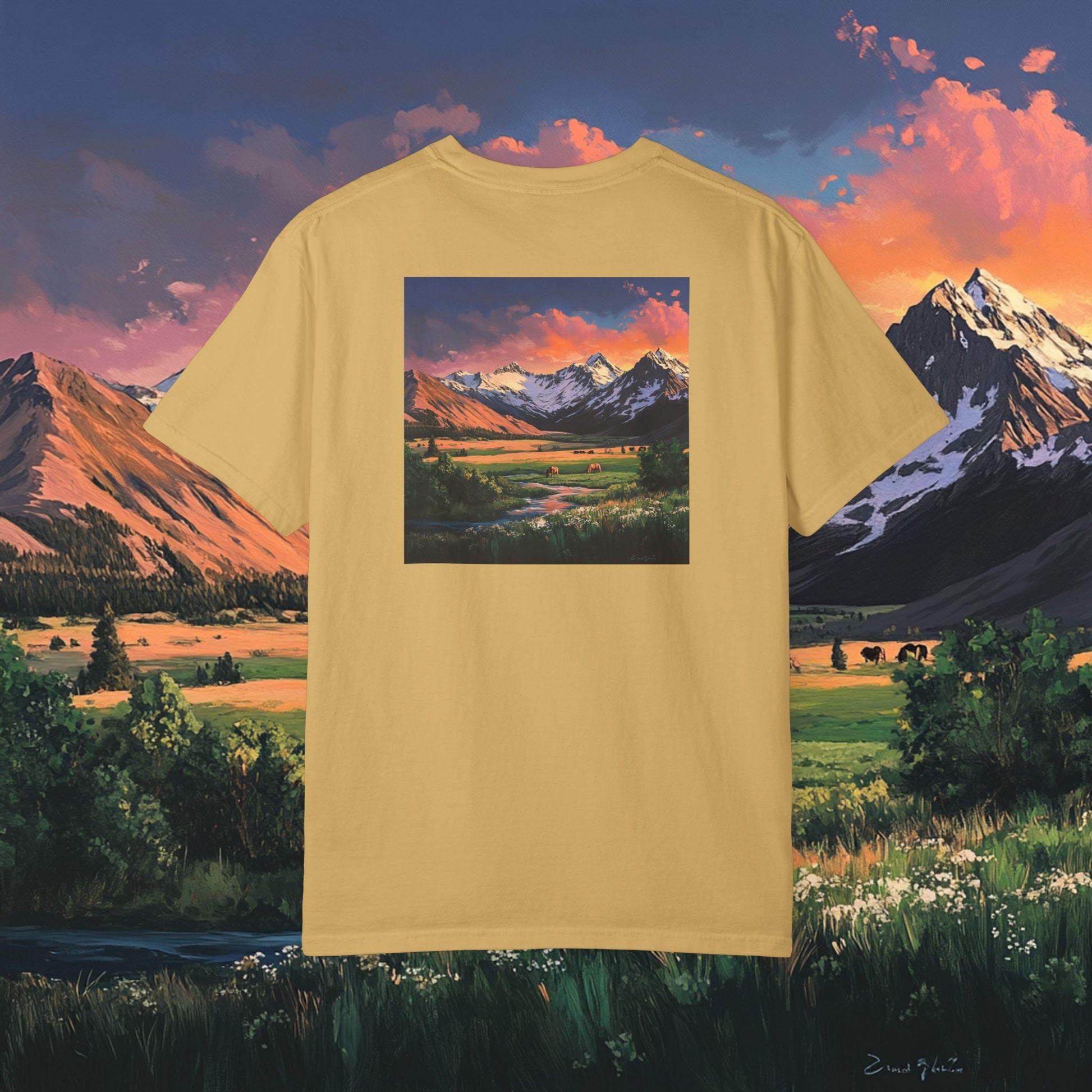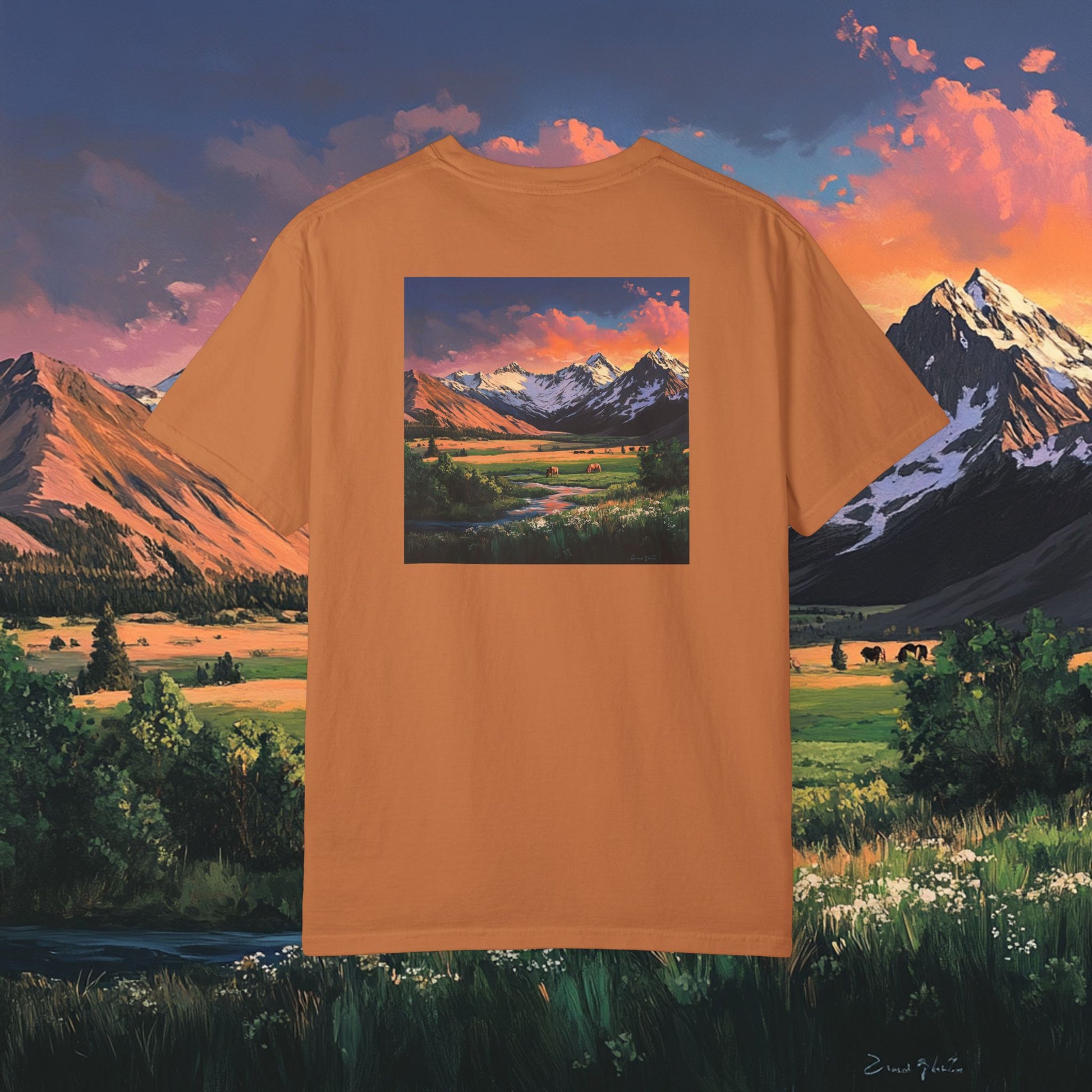 Elevate your wardrobe with this versatile Unisex T-shirt. With a stunning graphic design that captures the beauty of nature, it embodies a relaxed and adventurous spirit. Perfect for casual outings, art exhibitions, or cozy days at home, this T-shirt offers comfort without sacrificing style. Ideal for outdoor enthusiasts, artists, and anyone who appreciates the great outdoors. It's a thoughtful gift for birthdays, holidays, or just to brighten someone’s day. Product features - Available in sizes S to 4XL for a perfect fit. - Durable double-needle stitching on all seams. - Seamless tubular design reduces fabric waste and enhances aesthetics. - Garment-dyed for a soft, rich texture and color. - 100% ethically sourced US cotton ensures lasting comfort. Care instructions - Machine wash: cold (max 30C or 90F) - Do not bleach - Tumble dry: low heat - Iron, steam or dry: low heat - Do not dryclean