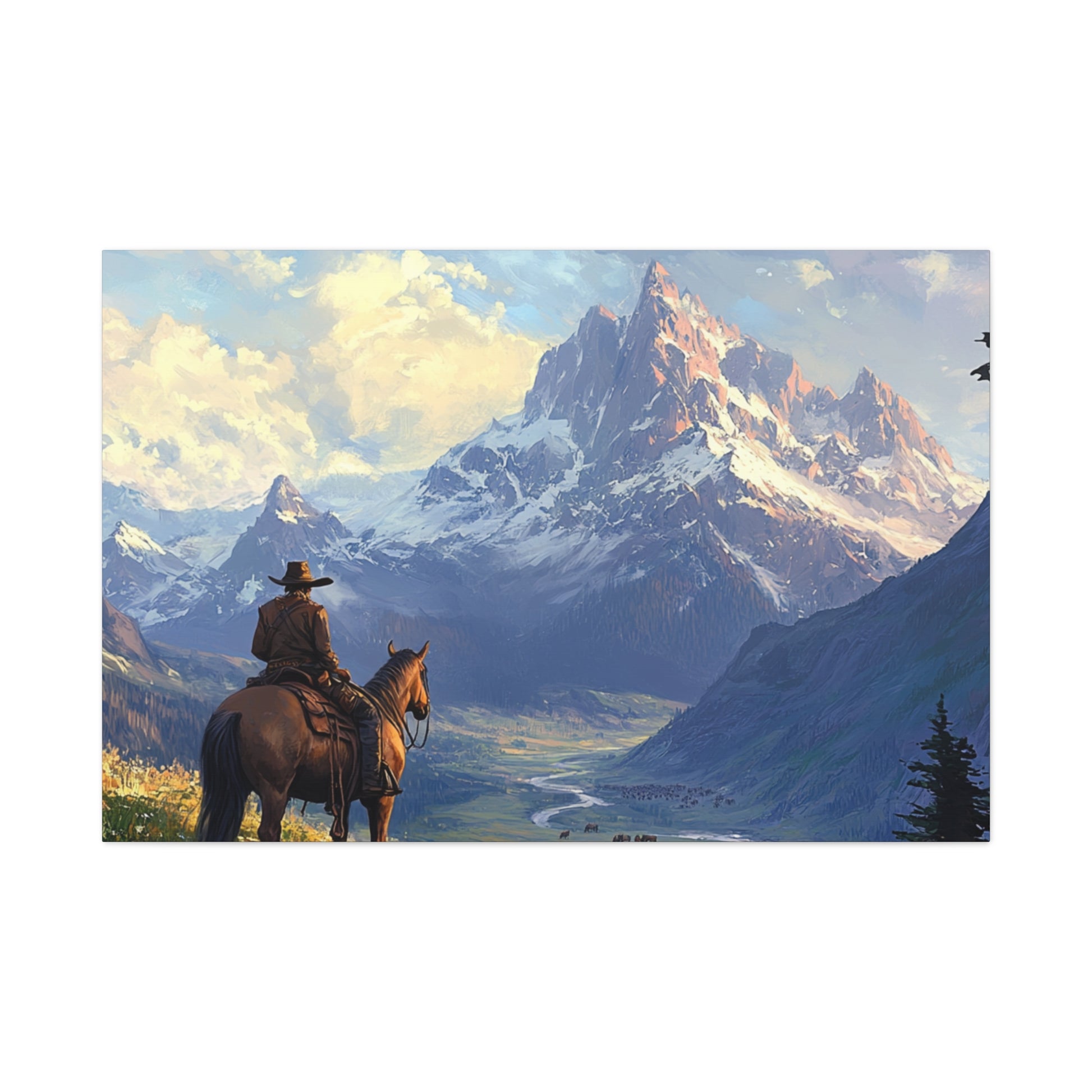 Immerse yourself in the beauty of the Wild West with this stunning canvas print featuring a lone cowboy on horseback overlooking majestic mountains. Perfect for fans of Western art and adventure seekers, this piece captures the essence of solitude and exploration. Ideal for home decor or as a unique gift for nature lovers and outdoor enthusiasts. Celebrate Western themes, cowboy culture, and love of nature with this timeless artwork.