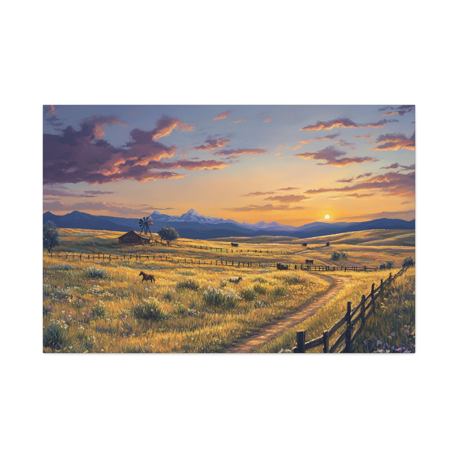 Bring the peaceful beauty of a vast prairie at sunset into your home with this stunning canvas print. The warm tones of the sunset and cool blues of the encroaching night create a peaceful yet poignant mood, perfect for adding a touch of nature to any space. Ideal for those who appreciate the beauty of open landscapes and the tranquility of sunsets. Relevant for home decor, gifts for nature lovers, farmhouse decor, and rustic-themed spaces. Perfect for celebrating National Prairie Day, National Cowboy Day, or as a housewarming gift.