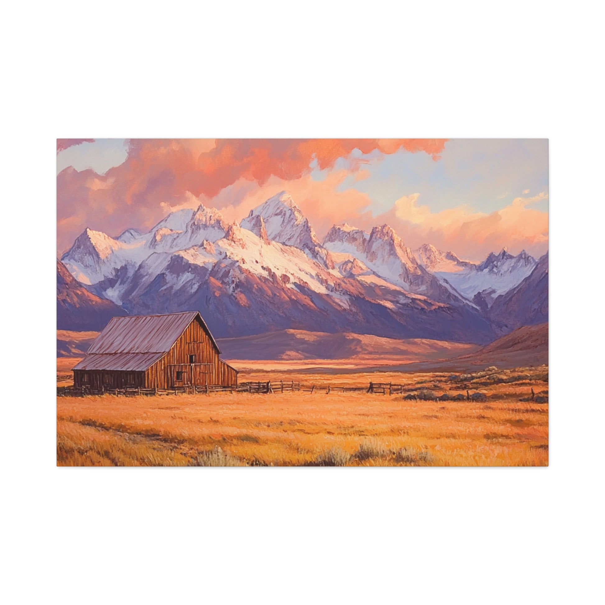 A stunning painting style landscape of a western valley with snow capped mountains in the background and tan switch grass in the forefront, bathed in orange and pink hues of a setting sun. An old wooden barn adds to the rustic charm of the scene. This canvas print exudes a serene and peaceful vibe, perfect for nature lovers and those who appreciate scenic landscapes. Ideal for home decor, office spaces, or as a thoughtful gift for nature enthusiasts.