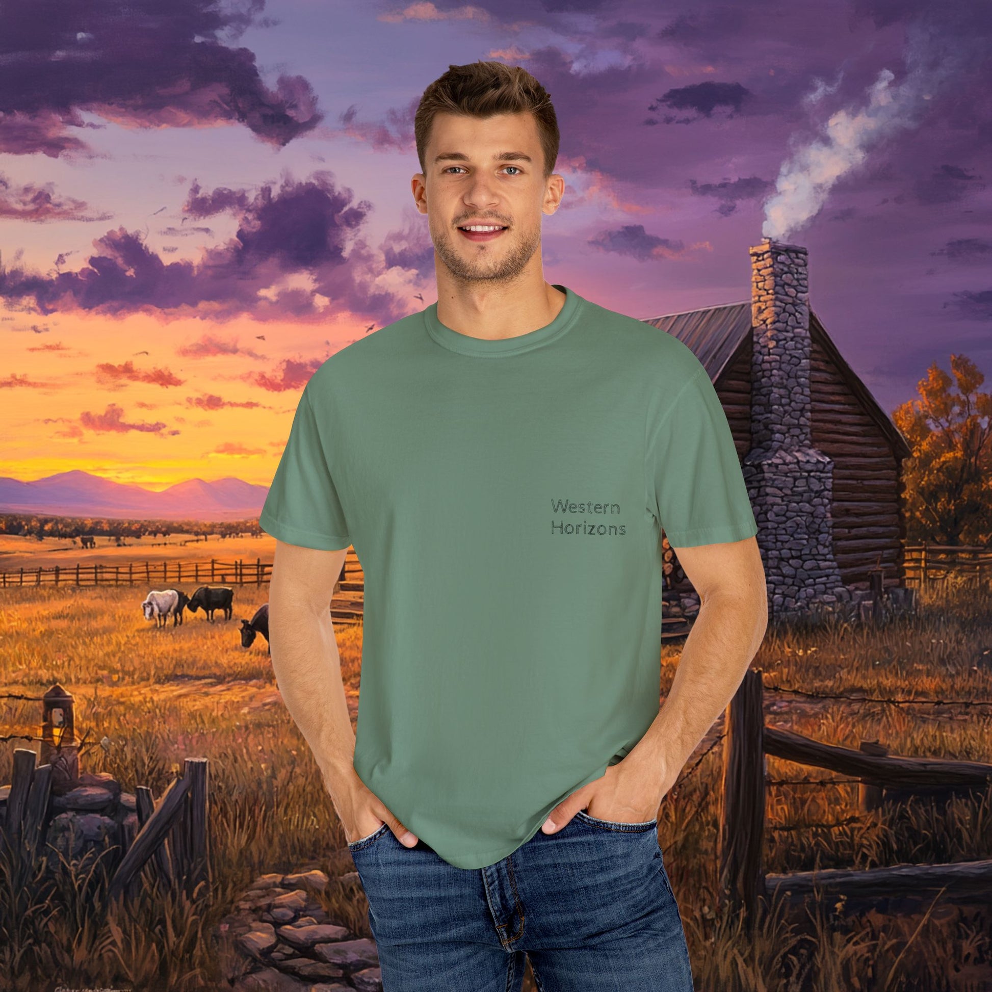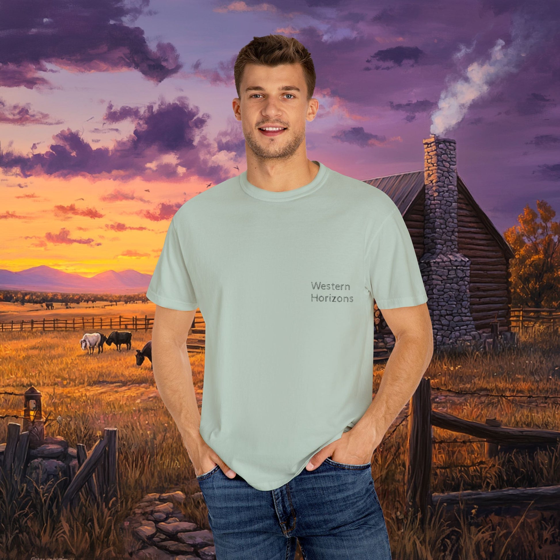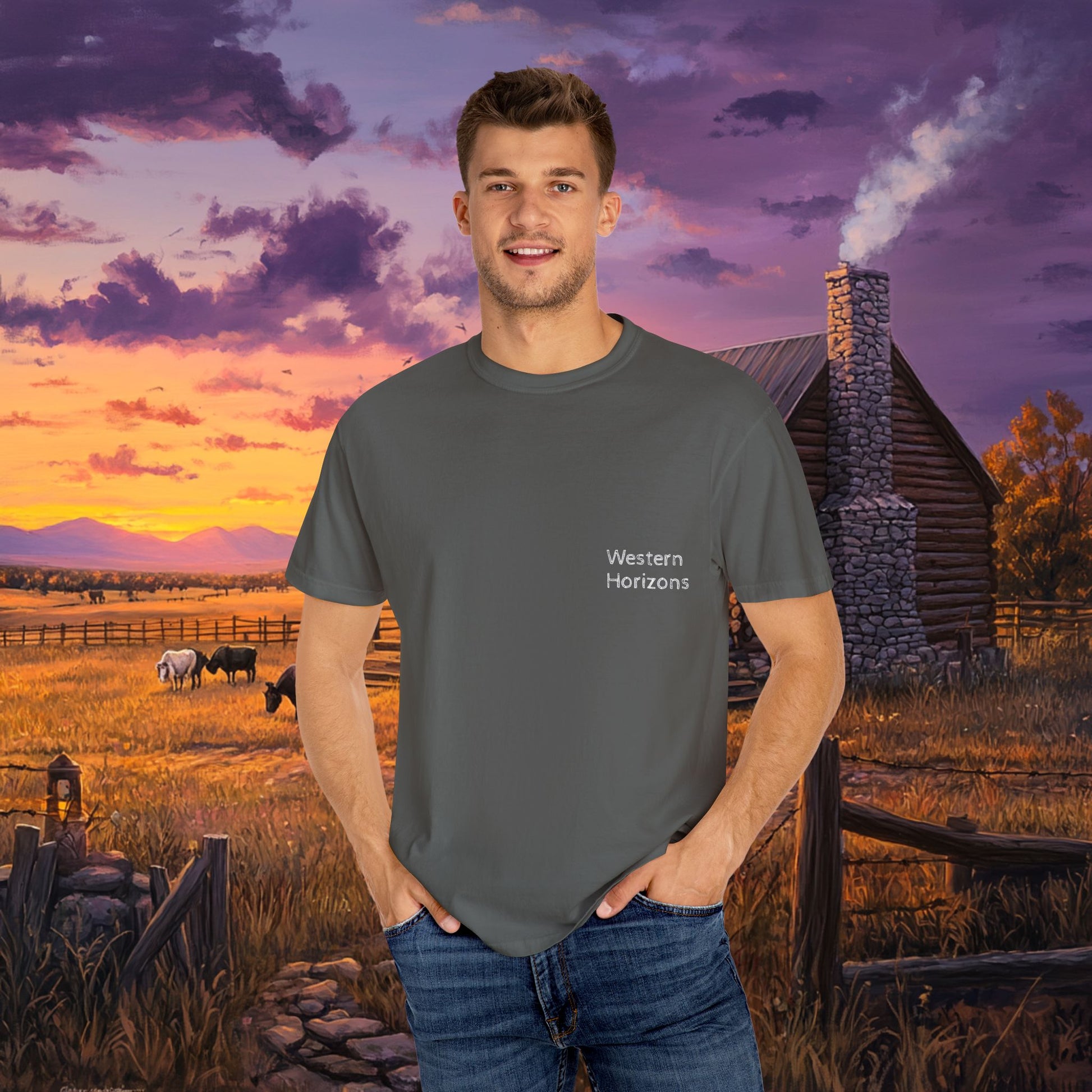 Embrace the pioneer spirit with this Comfort Colors T-Shirt featuring a stunning sunset backdrop. Perfect for those with a love for the Old West and frontier lifestyle. Ideal for Western enthusiasts and history buffs. Great for Western-themed parties, cowboy events, and historical reenactments. Product features - Available in sizes S to 4XL for the perfect fit - Double-needle stitching for durability - Garment-dyed fabric for soft color and texture - Made with 100% ring-spun US cotton for comfort - Relaxed fit and crew neckline for versatile styling Care instructions - Machine wash: cold (max 30C or 90F) - Do not bleach - Tumble dry: low heat - Iron, steam or dry: low heat - Do not dryclean