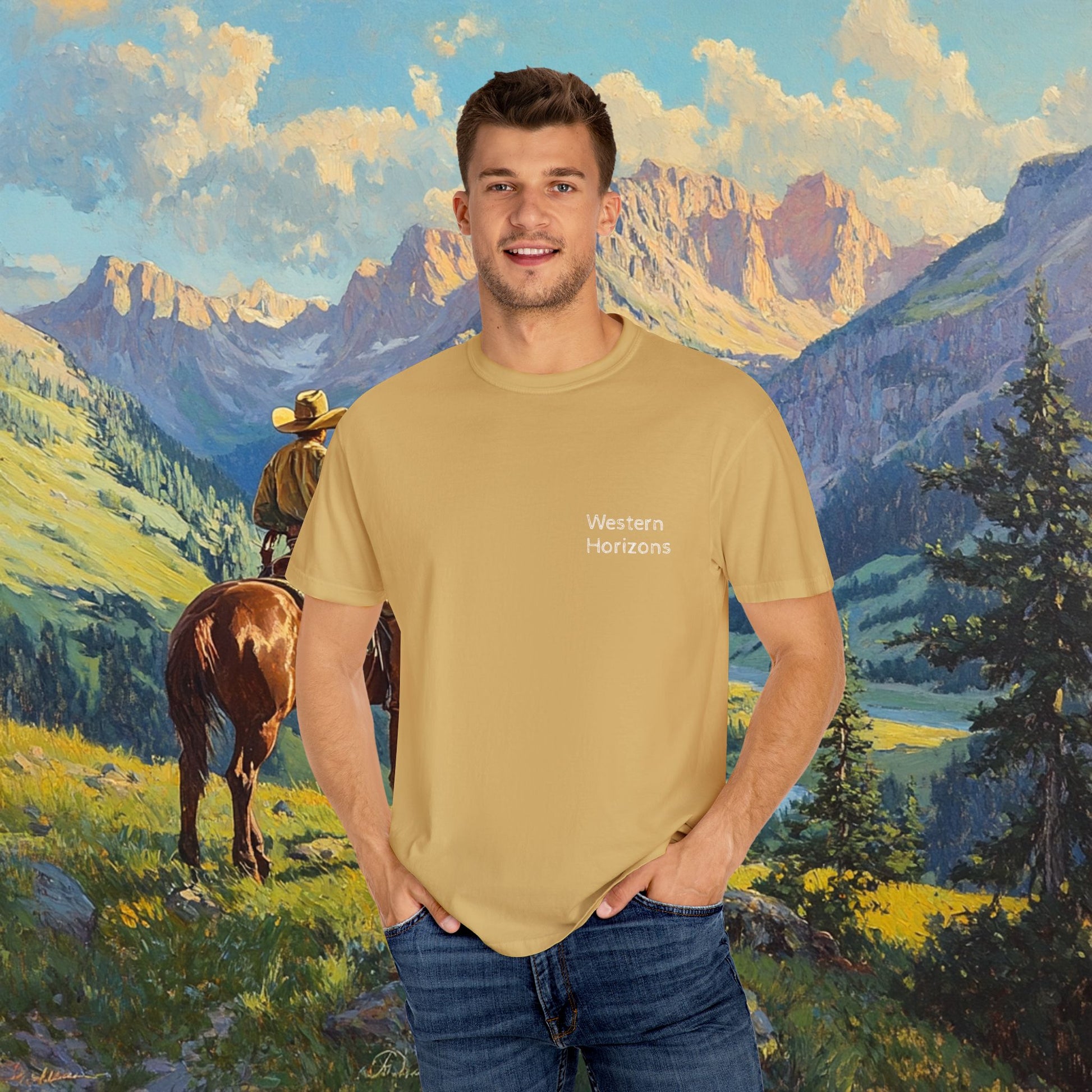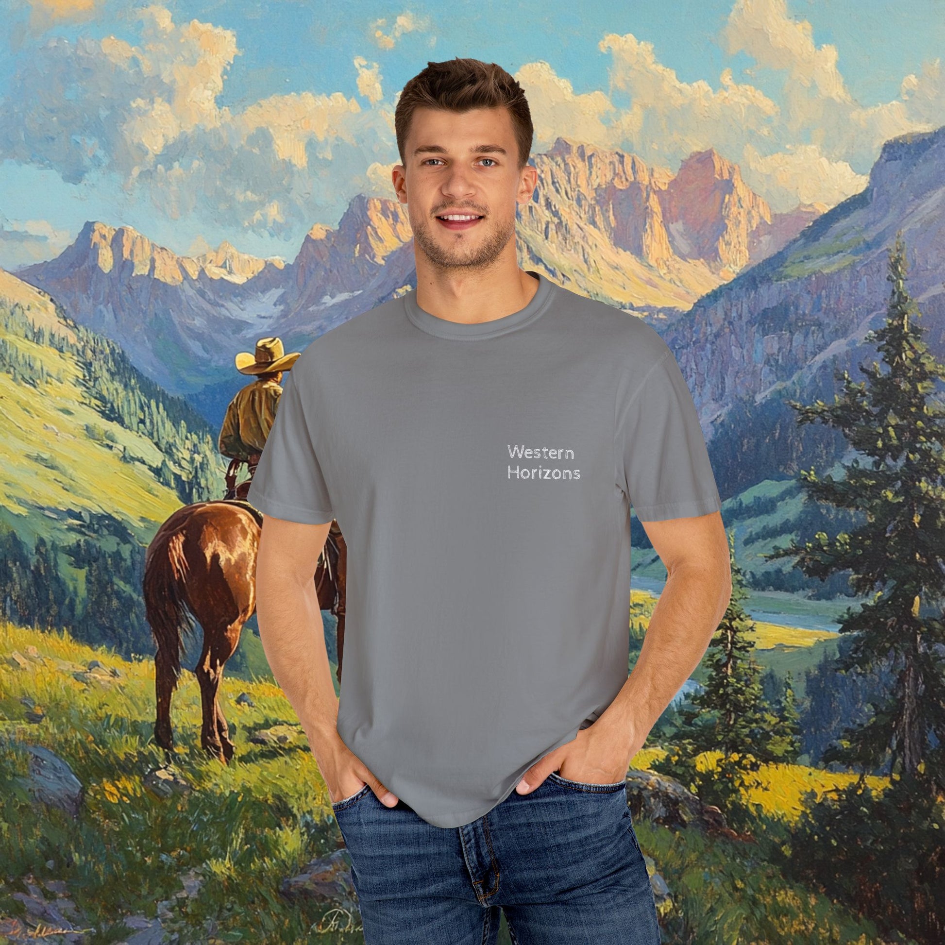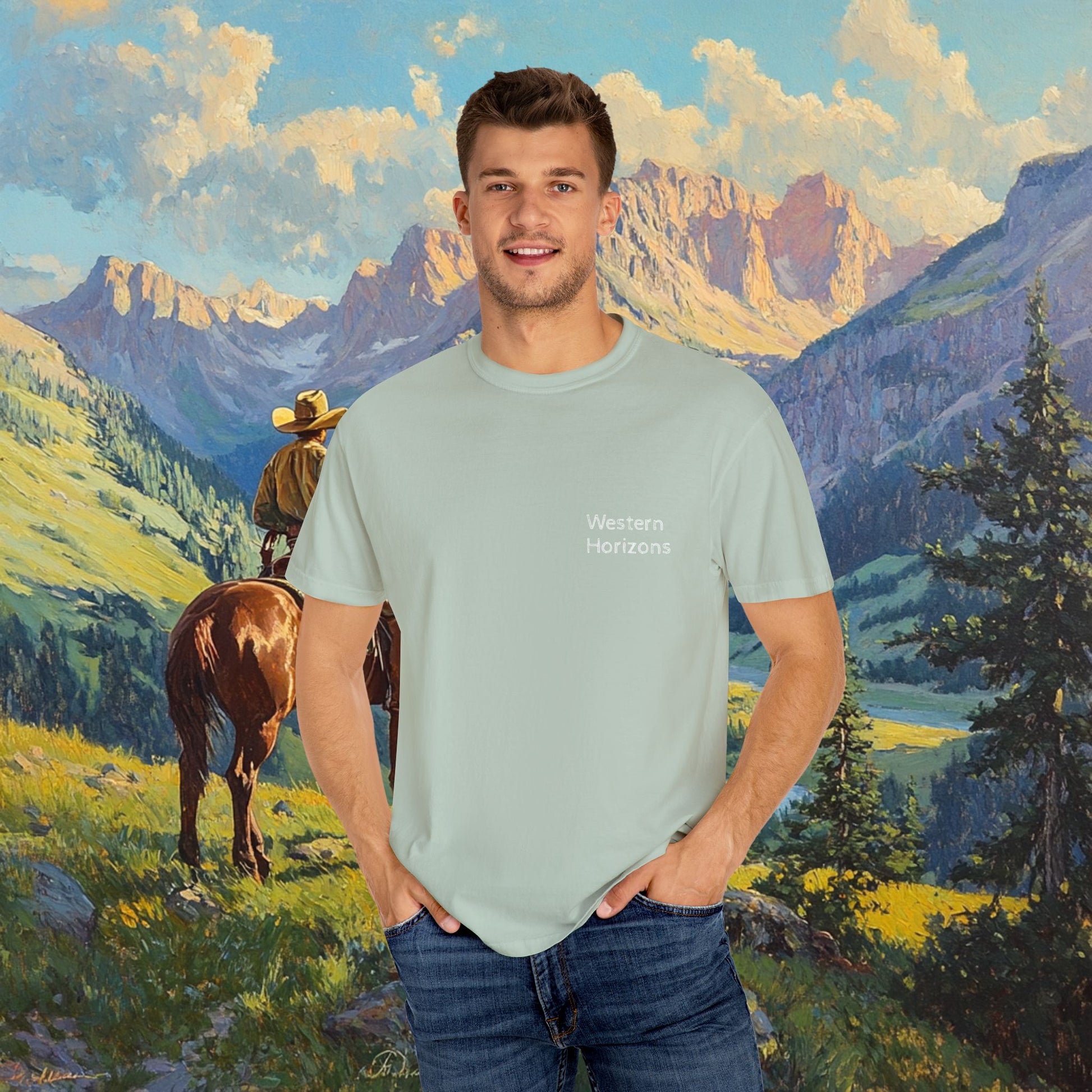 Capture the rugged beauty of the Wild West with this Comfort Colors T-shirt. Featuring a stunning Rocky Mountains Western Landscape, this tee exudes a sense of adventure and freedom. Perfect for those who love the outdoors, western culture, or simply want to express their love for the American frontier. Ideal for casual wear or as a statement piece for Western-themed events, rodeos, or cowboy gatherings. Product features - Available in sizes S to 4XL for a perfect fit - Double-needle stitching for durability - Garment-dyed fabric for a soft color and texture - Made with 100% US cotton for long-lasting comfort - Great for outdoor enthusiasts or Western culture enthusiasts Care instructions - Machine wash: cold (max 30C or 90F) - Do not bleach - Tumble dry: low heat - Iron, steam or dry: low heat - Do not dryclean