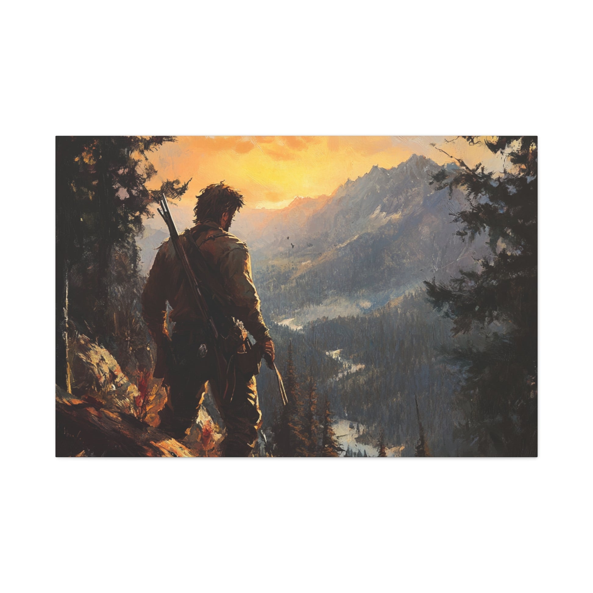 Experience the tension and drama of survival in American Primeval with this stunning canvas print featuring a lone frontiersman facing off against an unseen threat in the wilderness. The rich earthy tones and deep shadows create a cinematic atmosphere, while the warm sunset hues symbolize both an ending and an impending reckoning. Perfect for history buffs, nature enthusiasts, or anyone who appreciates high-stakes storytelling.