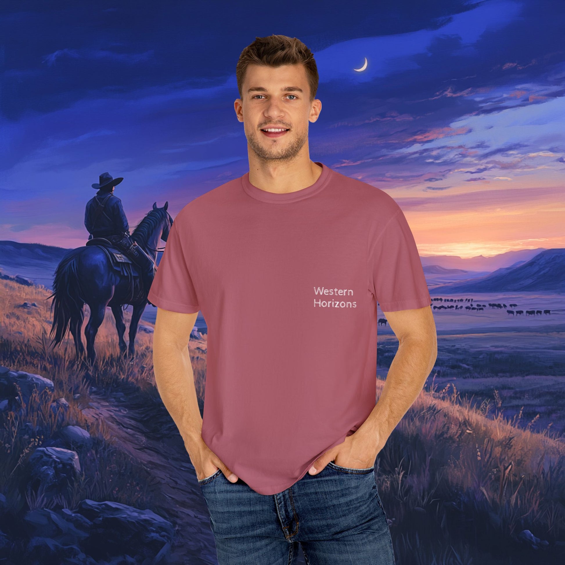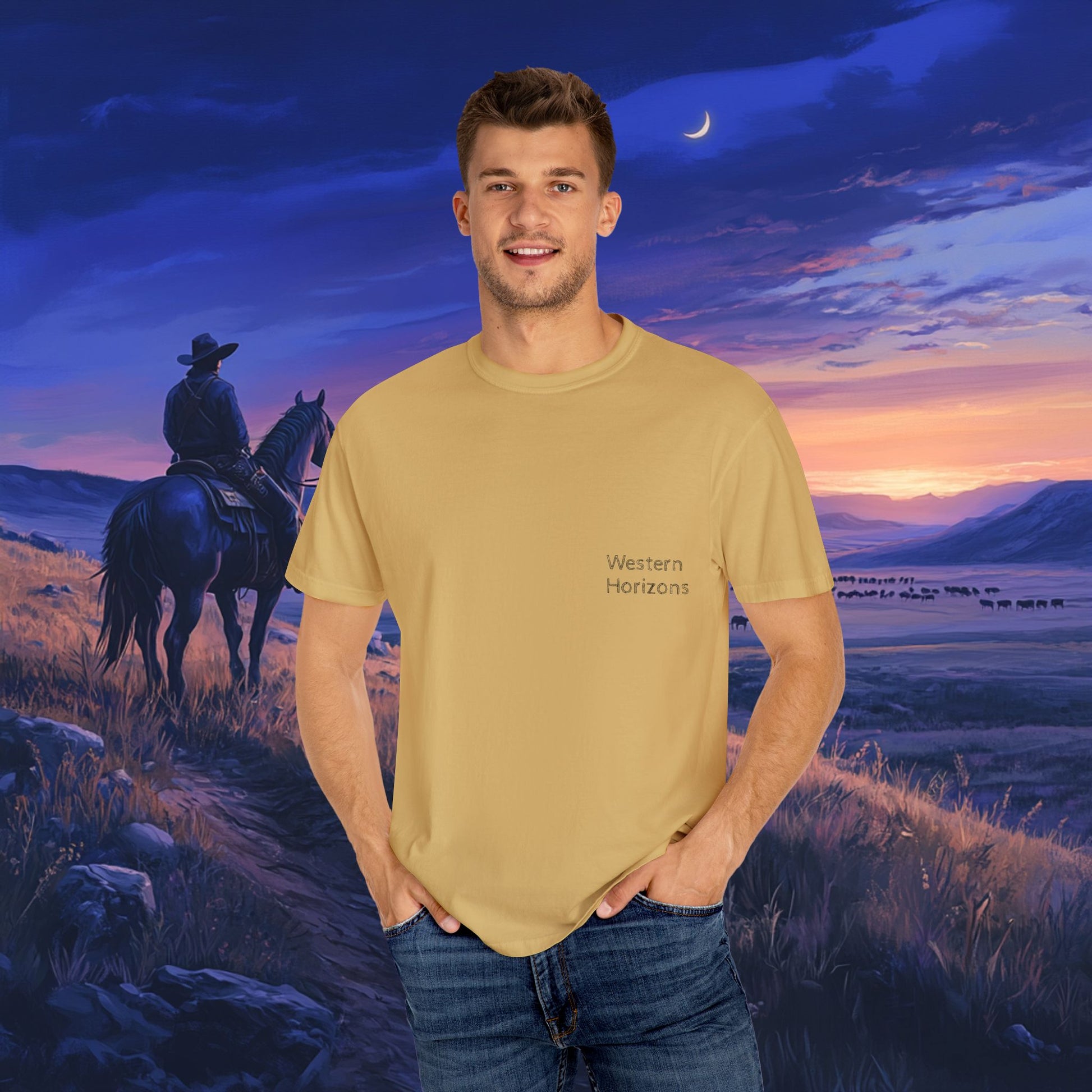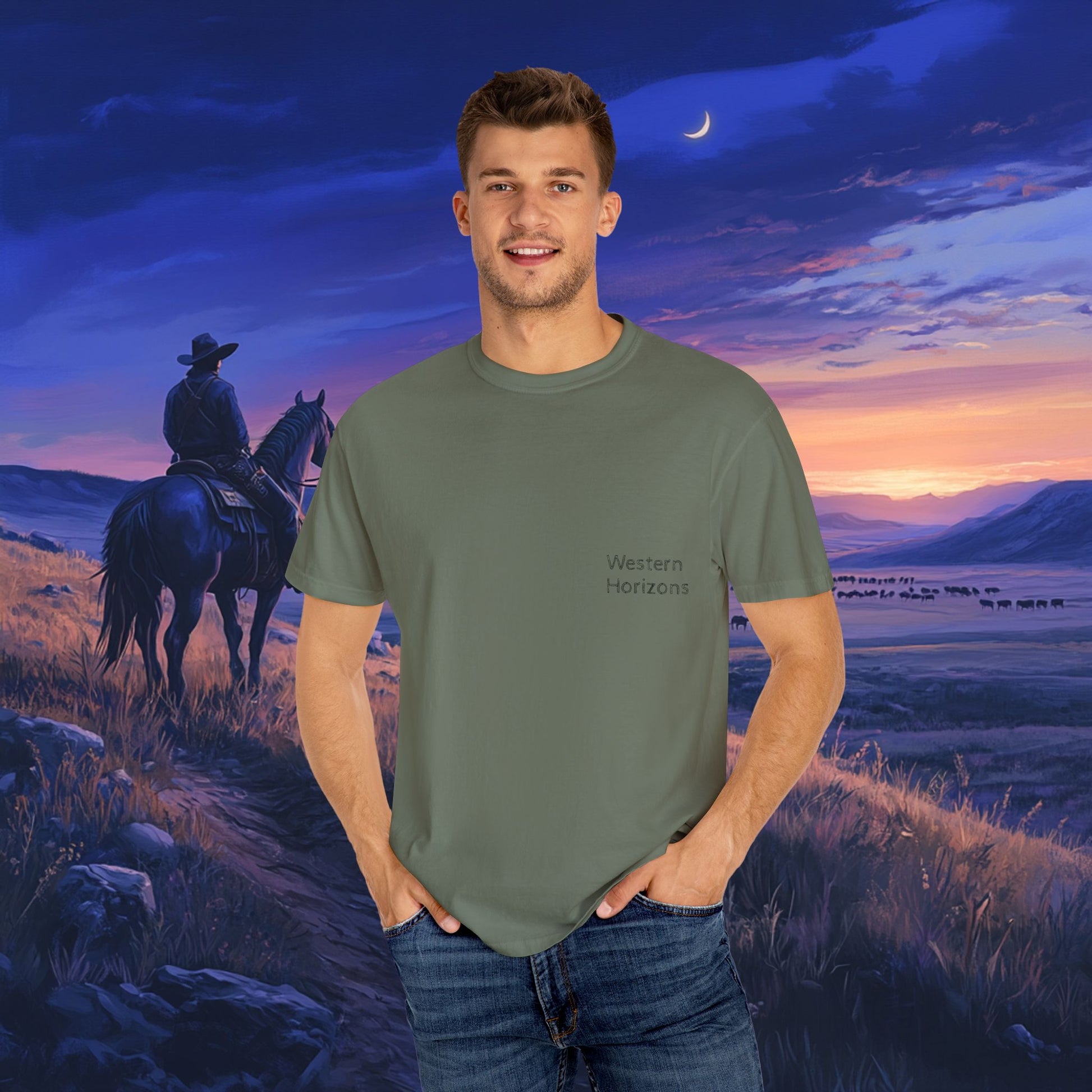 This Cowboy Sunset T-Shirt embodies the rustic charm of the Old West with a twilight cowboy design, making it a perfect gift for him. The unisex garment-dyed fabric gives a soft color and texture, perfect for casual and semi-formal settings. Ideal for adults who appreciate western themes, this tee is great for Western-themed parties, rodeos, and country music festivals. Product features - Available in multiple sizes from S to 4XL - Double-needle stitching for durability - Garment-dyed fabric for softness - Made with 100% US cotton for comfort - Ethically and sustainably produced in Honduras Care instructions - Machine wash: cold (max 30C or 90F) - Do not bleach - Tumble dry: low heat - Iron, steam or dry: low heat - Do not dryclean