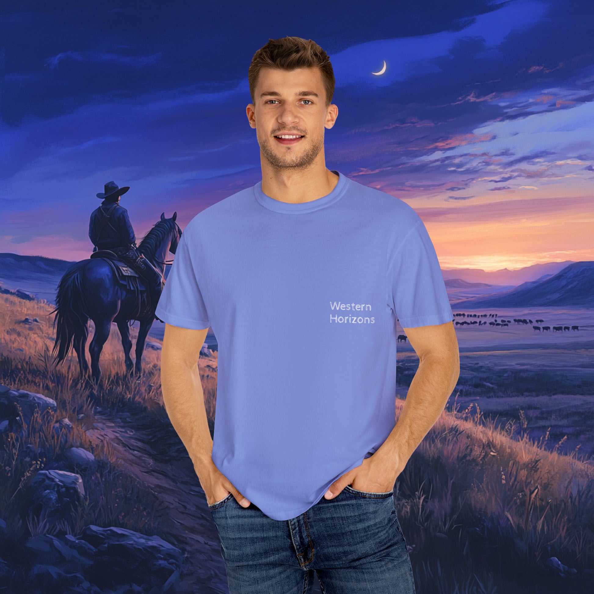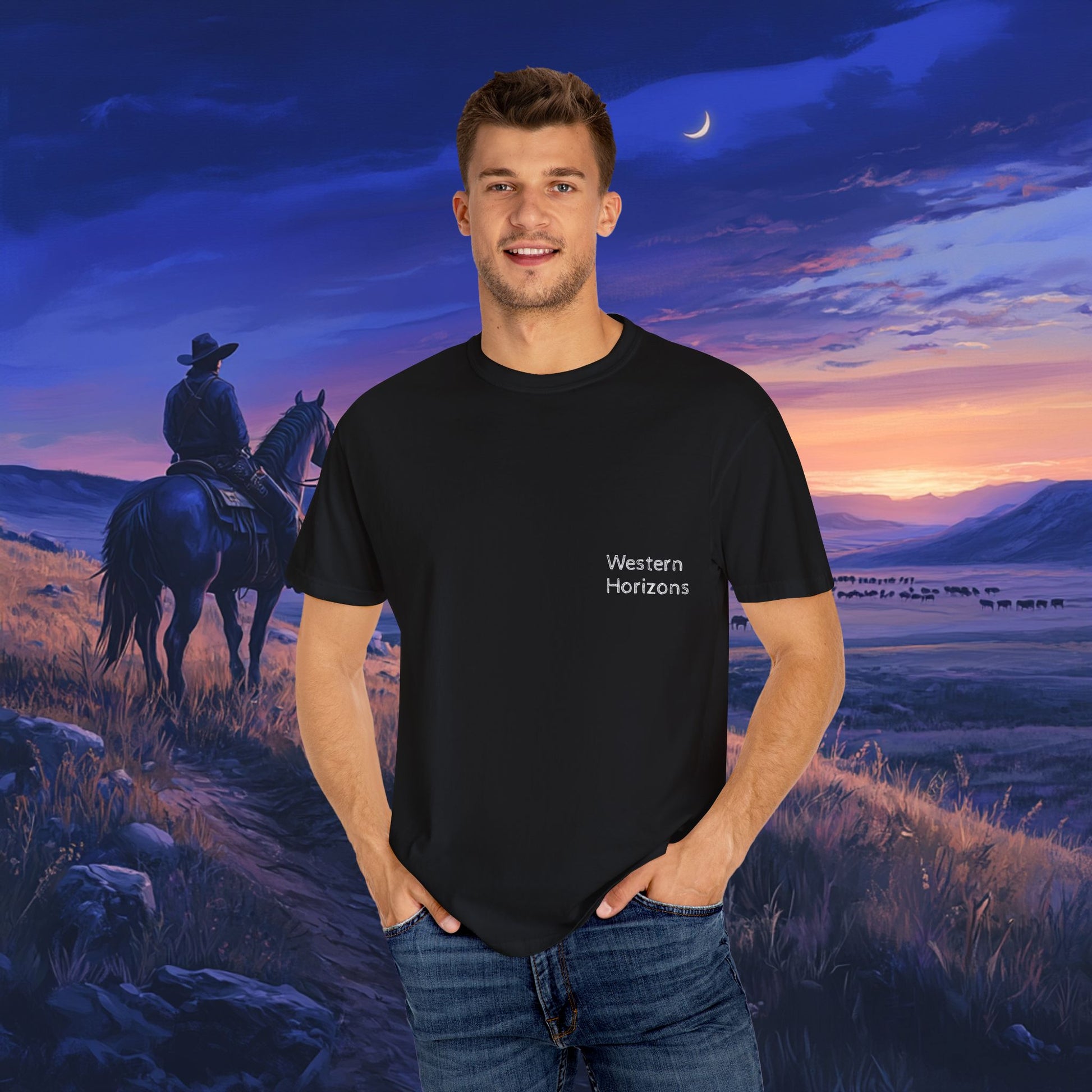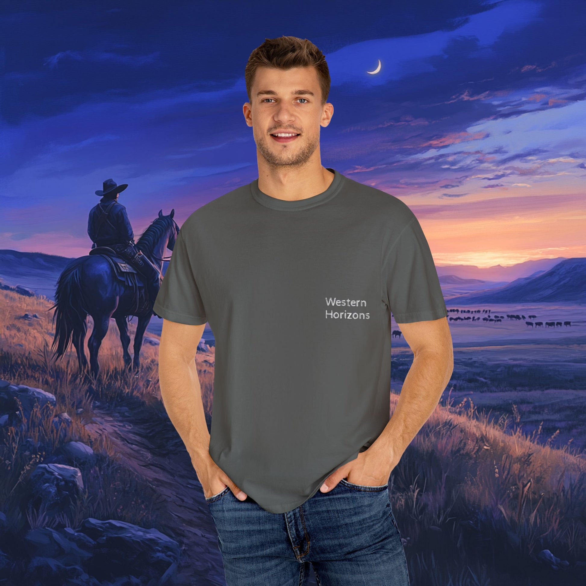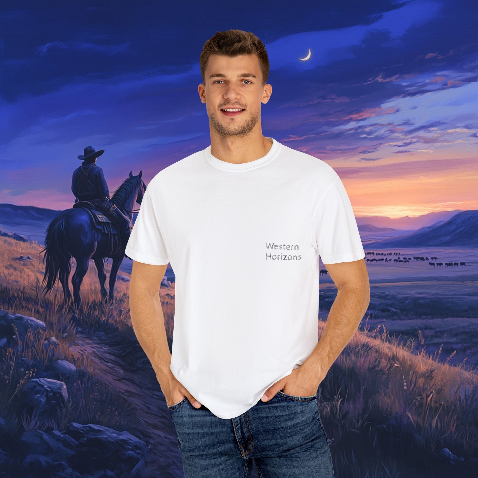 This Cowboy Sunset T-Shirt embodies the rustic charm of the Old West with a twilight cowboy design, making it a perfect gift for him. The unisex garment-dyed fabric gives a soft color and texture, perfect for casual and semi-formal settings. Ideal for adults who appreciate western themes, this tee is great for Western-themed parties, rodeos, and country music festivals. Product features - Available in multiple sizes from S to 4XL - Double-needle stitching for durability - Garment-dyed fabric for softness - Made with 100% US cotton for comfort - Ethically and sustainably produced in Honduras Care instructions - Machine wash: cold (max 30C or 90F) - Do not bleach - Tumble dry: low heat - Iron, steam or dry: low heat - Do not dryclean